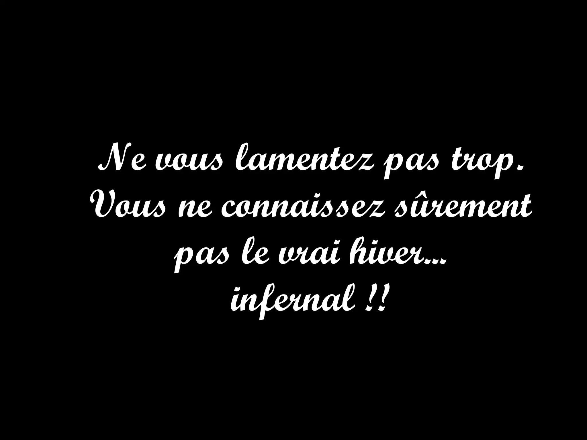 Le document exprime des sentiments sur l'hiver, suggérant qu'il est difficile et froid. L'auteur semble inciter les lecteurs à ne pas se plaindre de leur propre expérience. Il souligne la brutalité de l'hiver par des exclamations.