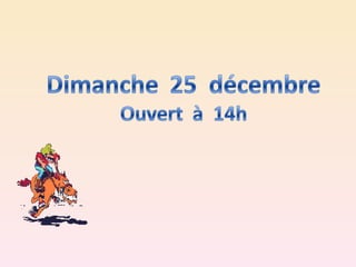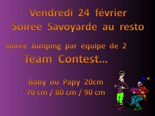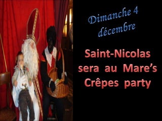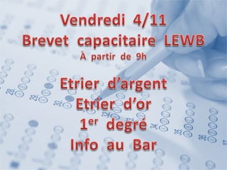 Le document présente le calendrier d'événements au Mare's Dream, incluant des concours de dressage, un drink de nouvel an, et des soirées thématiques. Il mentionne également des sessions d'entraînement en obstacle avec des juges officiels. Les activités se déroulent entre octobre 2011 et mars 2012.