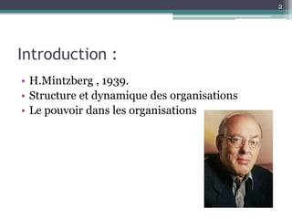 Ce document présente la dynamique des structures organisationnelles selon H. Mintzberg, en détaillant les éléments fondamentaux de l'organisation et les paramètres de conception, tels que la spécialisation et la formalisation. Les facteurs de contingence influençant ces structures, comme l'âge, la taille et l'environnement, sont également discutés, ainsi que les configurations organisationnelles identifiées par Mintzberg. En conclusion, il souligne que les structures organisationnelles doivent constamment évoluer pour s'adapter aux changements.