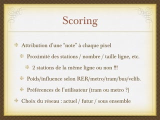 Le document discute de la visualisation de la densité des transports en commun à Paris à l'aide de cartes, en attribuant des scores à chaque pixel en fonction de divers critères comme la proximité des stations et le type de transport. Il présente différentes méthodes de visualisation, telles que des cartes de chaleur et des cartes interactives, en soulignant leur utilité pour l'immobilier, l'urbanisme et les décisions politiques. Les préférences des utilisateurs et les choix de réseau sont également pris en compte dans cette analyse.
