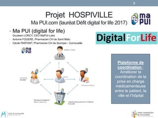 Le projet Hospiville vise à améliorer la coordination des soins médicamenteux entre patients, ville et hôpital via une plateforme sécurisée. Il inclut la mise en place d'outils de communication pour les médecins et patients, ainsi qu'un déploiement prévu sur plusieurs territoires. Le document évoque également des défis financiers et de communication entre les différents professionnels de santé impliqués.