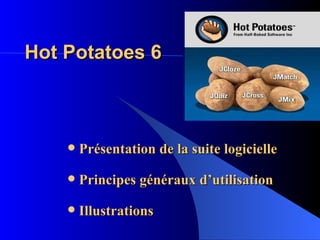 Hot Potatoes 6 est une suite logicielle permettant aux enseignants de créer divers exercices pédagogiques sous forme de pages web, nécessitant un navigateur pour être diffusés. Les modules inclus (JCLoze, JCross, JMix, JQuiz, JMatch) permettent de générer différents types d'exercices comme des fermetures, des mots croisés et des questionnaires. Chaque exercice est configuré selon les préférences de l'utilisateur, et le logiciel propose des options pour enregistrer et tester les exercices créés.