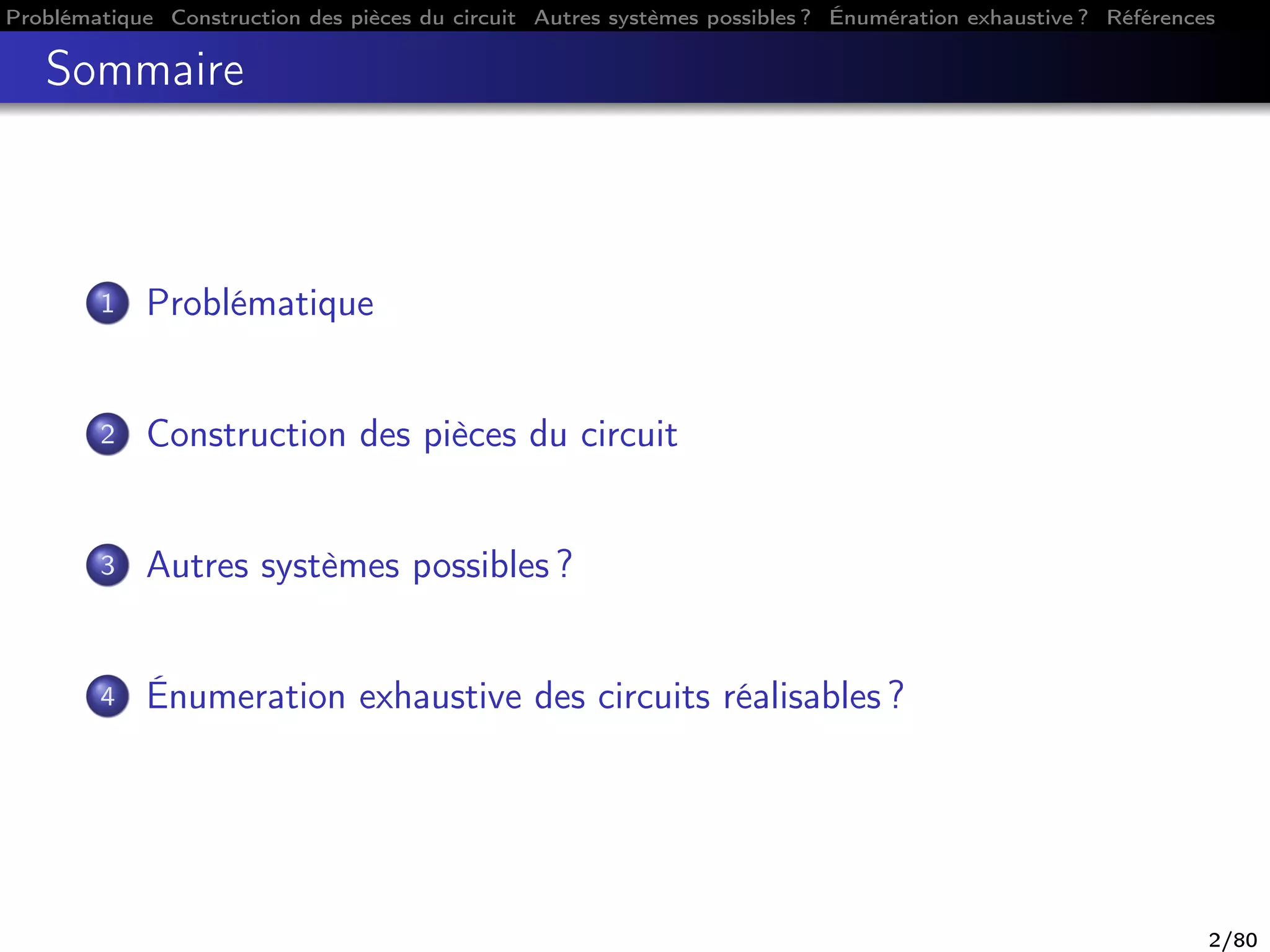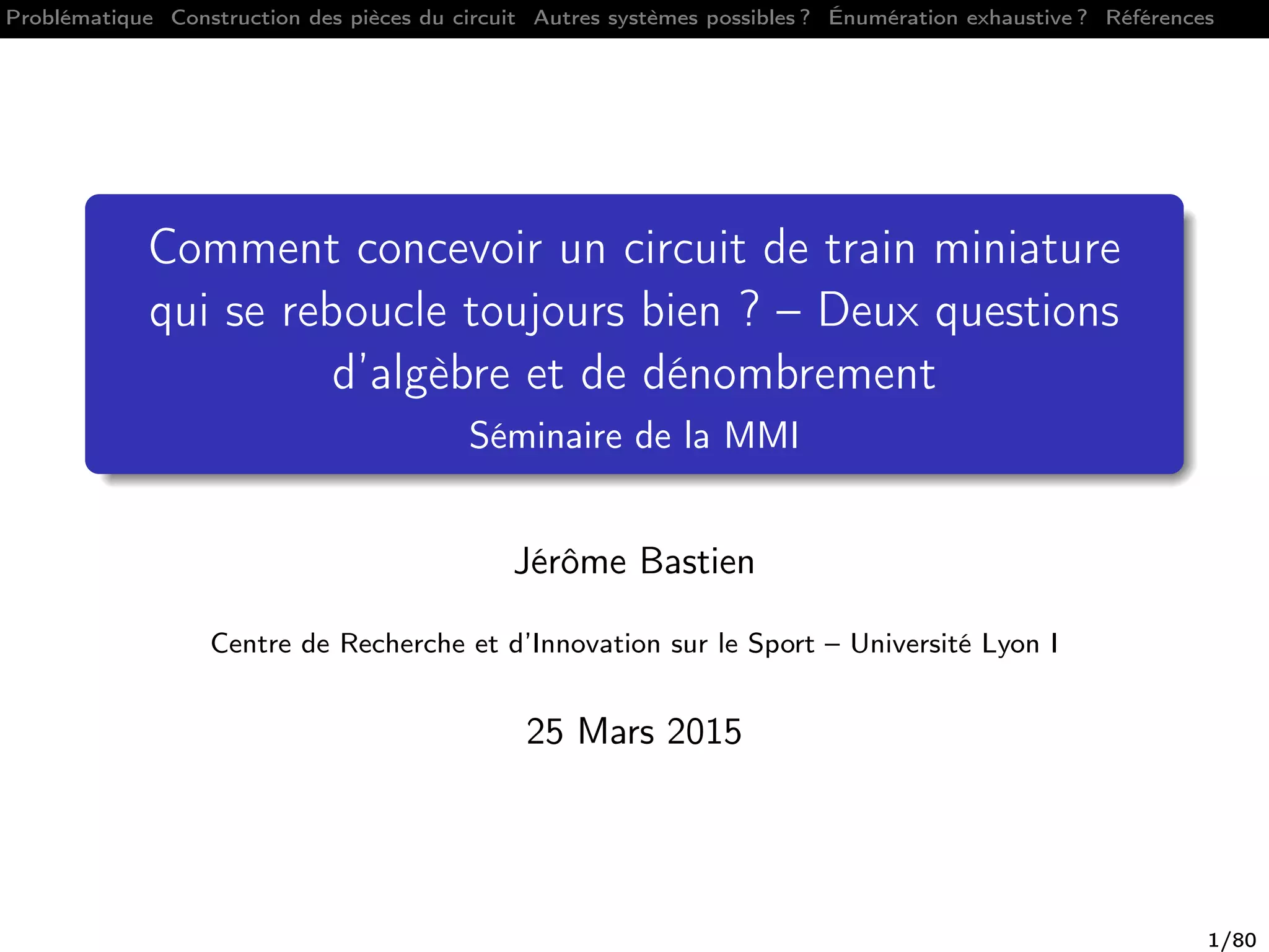 Le document présente une démarche pour concevoir un circuit de train miniature qui s'auto-ferme sans heurt ni torsion des rails, en utilisant six pièces de base modulables. Il aborde également la systématisation algébrique des formes de rails et la description exhaustive des circuits réalisables. Une solution géométrique simple est proposée, appuyée par un brevet sur un circuit apte à guider un véhicule miniature, et plusieurs exemples d'application montrent la flexibilité et l'efficacité du système.