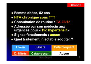 Ce document traite de la gestion des urgences hypertensives, en détaillant des cas cliniques variés et en soulignant l'importance de déterminer le traitement approprié en fonction de la situation clinique. Il présente des recommandations pour le diagnostic et le traitement des différentes causes d'hypertension, avec des considérations spécifiques pour les cas de souffrance viscérale et les urgences médicales. Des médicaments et des protocoles de traitement sont également fournis pour guider les praticiens dans la prise en charge de ces patients.