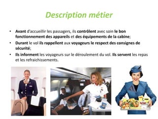 Le document décrit les responsabilités et les qualités requises pour devenir hôtesse de l'air, notamment le contrôle des équipements, l'information des passagers et le respect des consignes de sécurité. Il détaille également les conditions d'entrée, les études nécessaires et les perspectives de carrière. Enfin, il mentionne les salaires pouvant varier de 1 700 € à 3 500 € selon l'expérience et les compagnies.