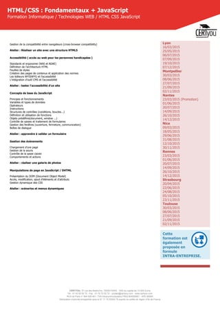 La formation 'HTML/CSS : Fondamentaux + JavaScript' proposée par Certyou vise à maîtriser la création de sites web en HTML/CSS et JavaScript, avec un programme couvrant les bases des langages de programmation web, la conception de pages, et des techniques avancées. Elle inclut également un coaching après les cours et s'adresse à divers publics tels que les webmasters et chefs de projet web. Des sessions sont organisées dans plusieurs villes françaises entre mars et décembre 2015.
