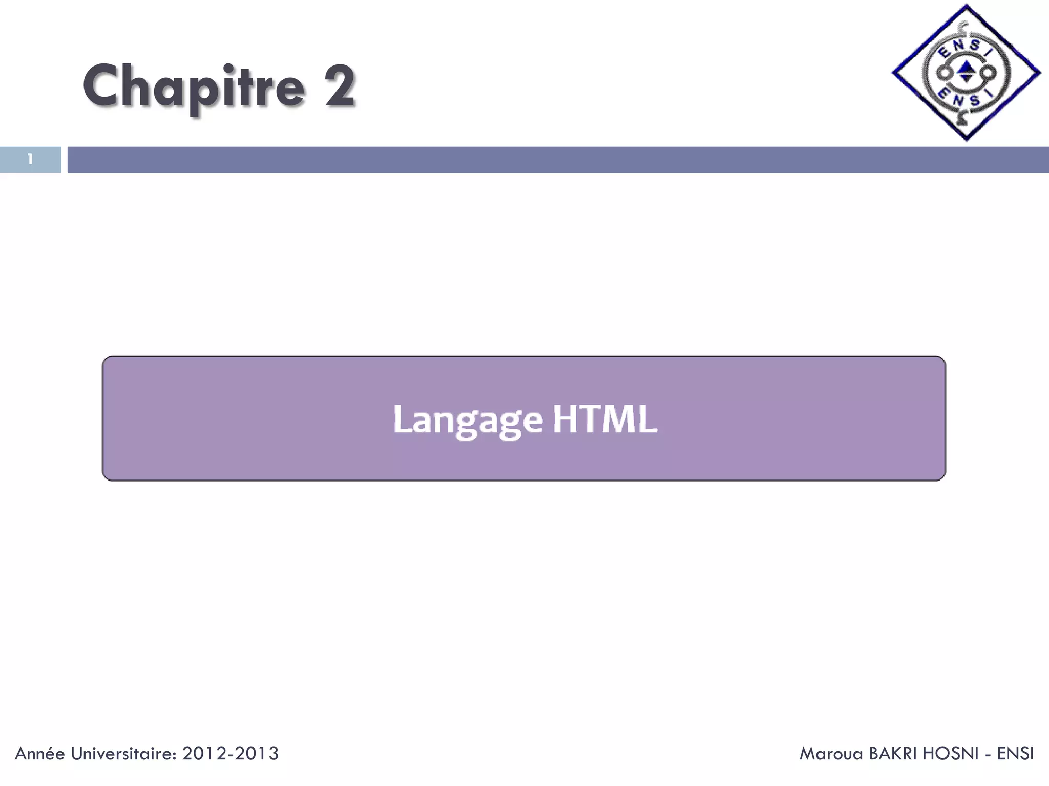 Le chapitre 2 de Maroua Bakri Hosni pour l'année universitaire 2012-2013 aborde la structure des documents HTML, y compris les balises, attributs, et différents éléments comme le texte, titres, images, et formulaires. Il fournit également un aperçu sur les listes, tableaux, et les médias tels que vidéo et audio. Ce chapitre sert de guide complet pour comprendre la création et la structuration des documents HTML.
