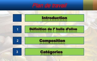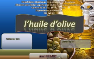 Le document présente une étude approfondie de l'huile d'olive, y compris sa définition, sa composition, ses catégories et ses processus de production. L'huile d'olive, considérée comme un aliment sain riche en nutriments, joue un rôle central dans l'alimentation méditerranéenne. La réglementation impose des contrôles de qualité et d'étiquetage pour protéger les consommateurs des pratiques commerciales trompeuses.