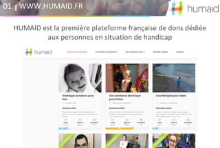 Humaid est la première plateforme française de dons dédiée aux personnes en situation de handicap et permet de financer leurs besoins essentiels non couverts par la sécurité sociale. Elle met en relation des donateurs et des porteurs de projet pour récolter des fonds directement, offrant ainsi une expérience de dontraçable et accessible. En plus d'oeuvrer pour l'amélioration de la vie des personnes handicapées, Humaid favorise également l'engagement social des entreprises et de la société civile.