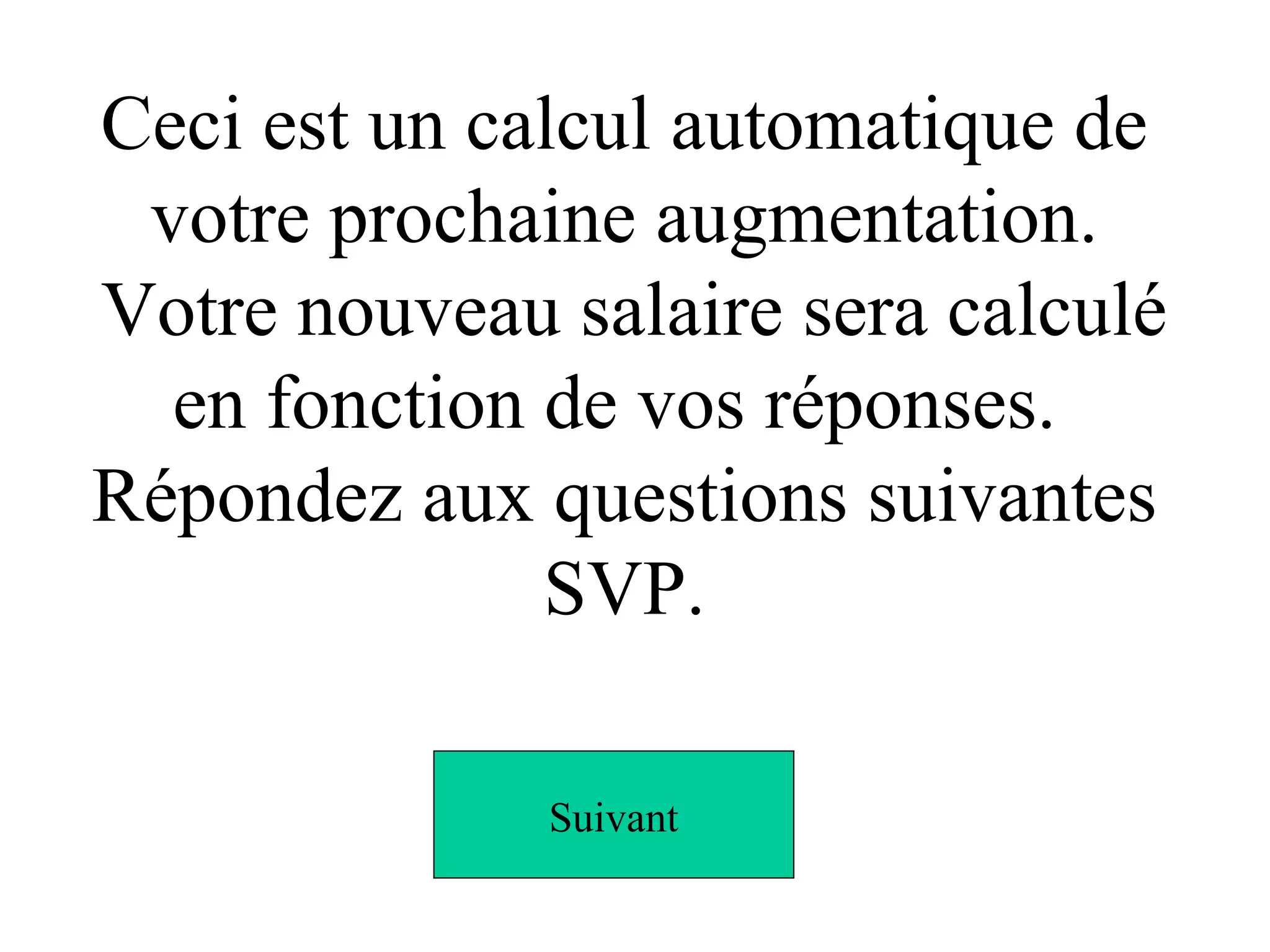 Le document est un calculateur automatique pour déterminer la prochaine augmentation de salaire basé sur les réponses de l'utilisateur. Il demande à plusieurs reprises si l'utilisateur souhaite une augmentation, et les réponses indiquent que le salaire restera inchangé. À la fin, il remercie l'utilisateur et l'invite à reprendre son travail.