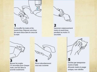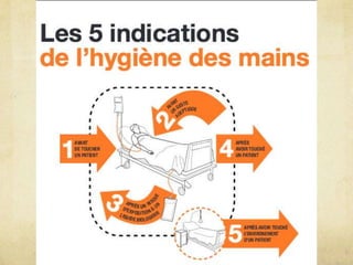 Ce document traite de l'hygiène des mains comme mesure essentielle pour prévenir les infections, en détaillant les types de lavages (simple, hygiénique, chirurgical) et l'utilisation de solutions hydro-alcooliques. Il souligne l'importance de suivre des procédures strictes en fonction du niveau de risque infectieux associé aux soins. Des références historiques et des recommandations de l'OMS sont également mentionnées.