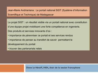 Le document présente divers projets et initiatives liés au système d’information scientifique et technique (SIST) à Madagascar et en Afrique, mettant en avant l'importance du développement et de la pérennisation de ces portails. Il aborde également la numérisation des thèses et les besoins en compétences des documentalistes, ainsi que les défis financiers et matériels rencontrés pour une meilleure diffusion de l'information. Enfin, il souligne la nécessité de partenariats et d'une collaboration efficace pour répondre aux demandes des utilisateurs et à l'adéquation entre l'offre et la demande en information.