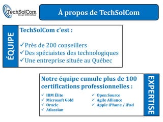 Techsolcom, une entreprise québécoise fondée en 2003 avec près de 200 conseillers spécialisés, propose des solutions d'intégration et de sécurité via des dispositifs Datapower tels que le modèle xi50 et xs40. Ces solutions visent à simplifier le déploiement et améliorer la sécurité des échanges de données entre différentes applications à haute performance tout en respectant les normes de l'industrie. Les bénéfices incluent l'intégration des applications internes avec des systèmes externes, l'optimisation des communications, et la conformité aux exigences réglementaires.