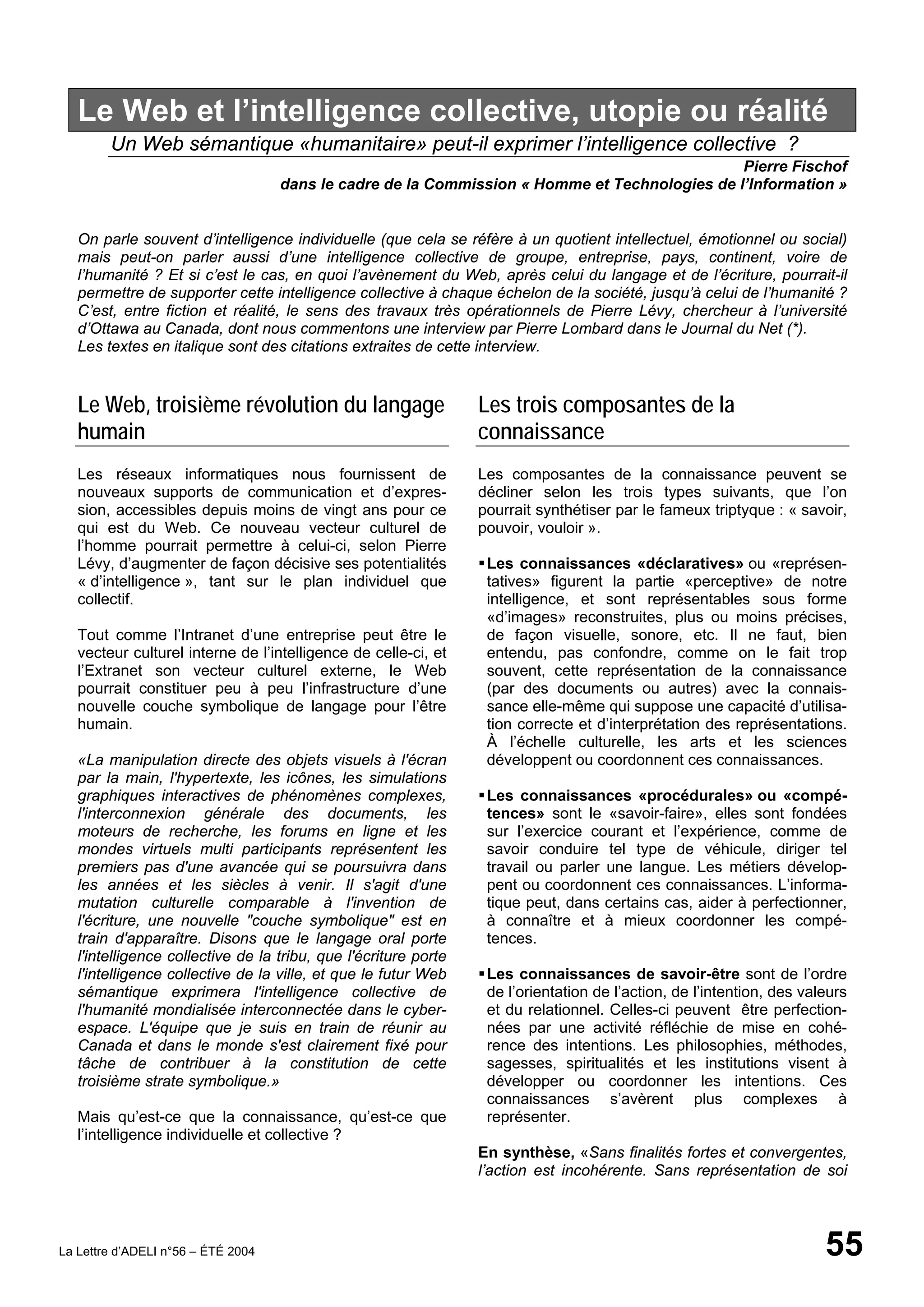 Le document explore la notion d'intelligence collective dans le contexte du web sémantique proposé par Pierre Lévy, soulignant comment les nouvelles technologies de l'information peuvent favoriser une interconnexion des connaissances à différents niveaux de la société. Il aborde également les enjeux et défis de cette interconnexion, notamment la nécessité d'une compréhension commune et la transformation des modes de communication. Enfin, la création d'un 'collective intelligence network' est envisagée comme un moyen d'organiser et mutualiser les connaissances à l'échelle mondiale.