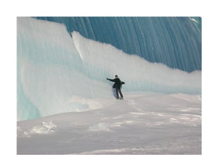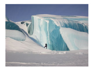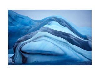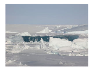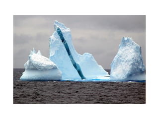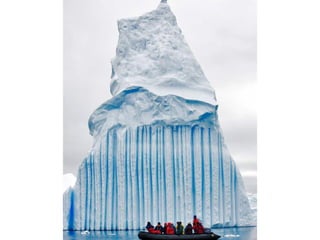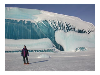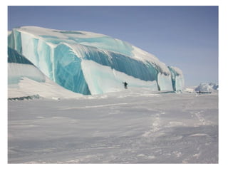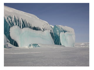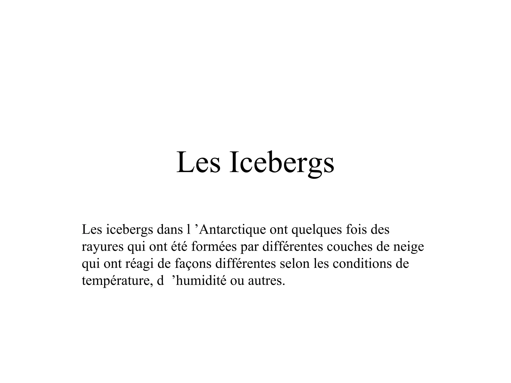 Les rayures des icebergs en Antarctique sont le résultat de réactions différentielles de couches de neige aux variations de température et d'humidité. Les couleurs des rayures varient selon leur origine, comme les crevasses remplies d'eau pour le bleu, ou les sédiments pour le noir, brun ou gris. Des vagues se gelant au contact de la glace illustrent les températures extrêmement froides de la région.