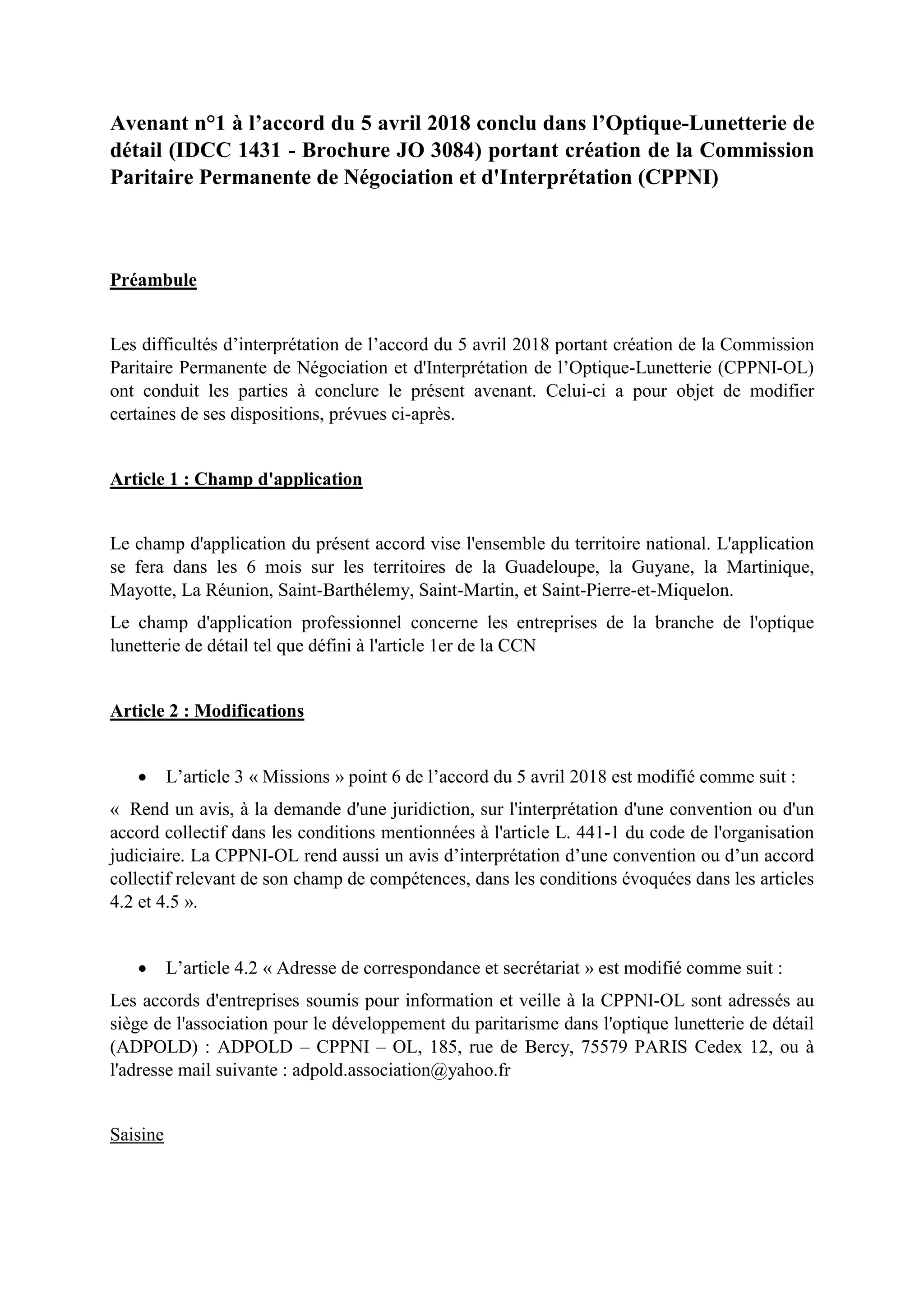 L'avenant n°1 au protocole du 5 avril 2018 introduit des modifications relatives à la commission paritaire permanente de négociation et d'interprétation dans le secteur de l'optique-lunetterie. Il précise le champ d'application et les conditions de saisine pour l'interprétation et la conciliation des litiges, ainsi que les responsabilités du secrétariat. Cet avenant, en vigueur depuis sa signature, peut être révisé ou dénoncé selon le code du travail.