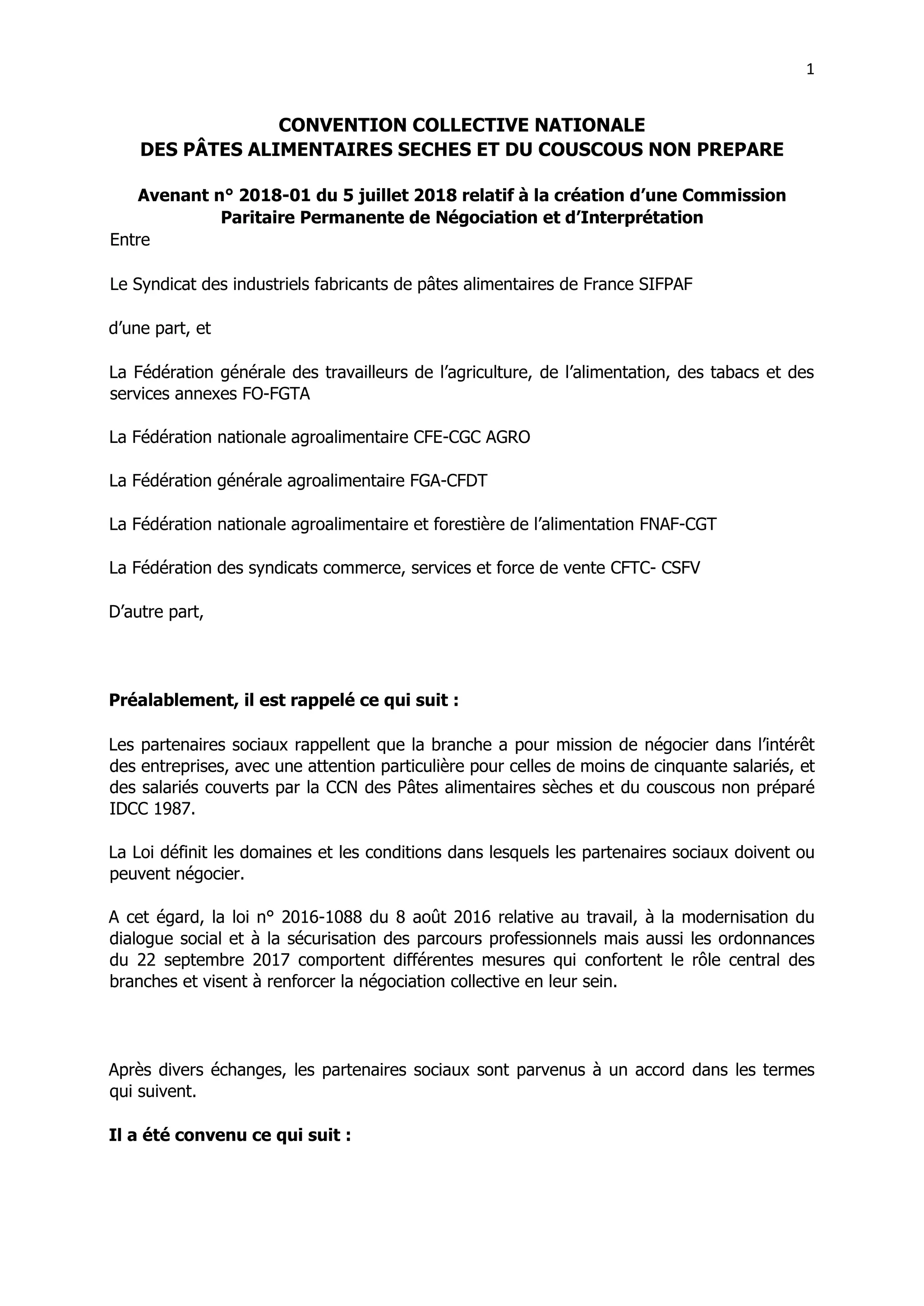 La convention collective nationale des pâtes alimentaires sèches et du couscous non préparé a été amendée pour établir une commission paritaire permanente de négociation et d'interprétation (CPPNI), visant à améliorer le dialogue social et la représentation des salariés et employeurs. Cette CPPNI a plusieurs missions, incluant la négociation des accords de branche et la veille sur les conditions de travail. Le présent accord entre en vigueur immédiatement et sera suivi annuellement pour assurer son efficacité.