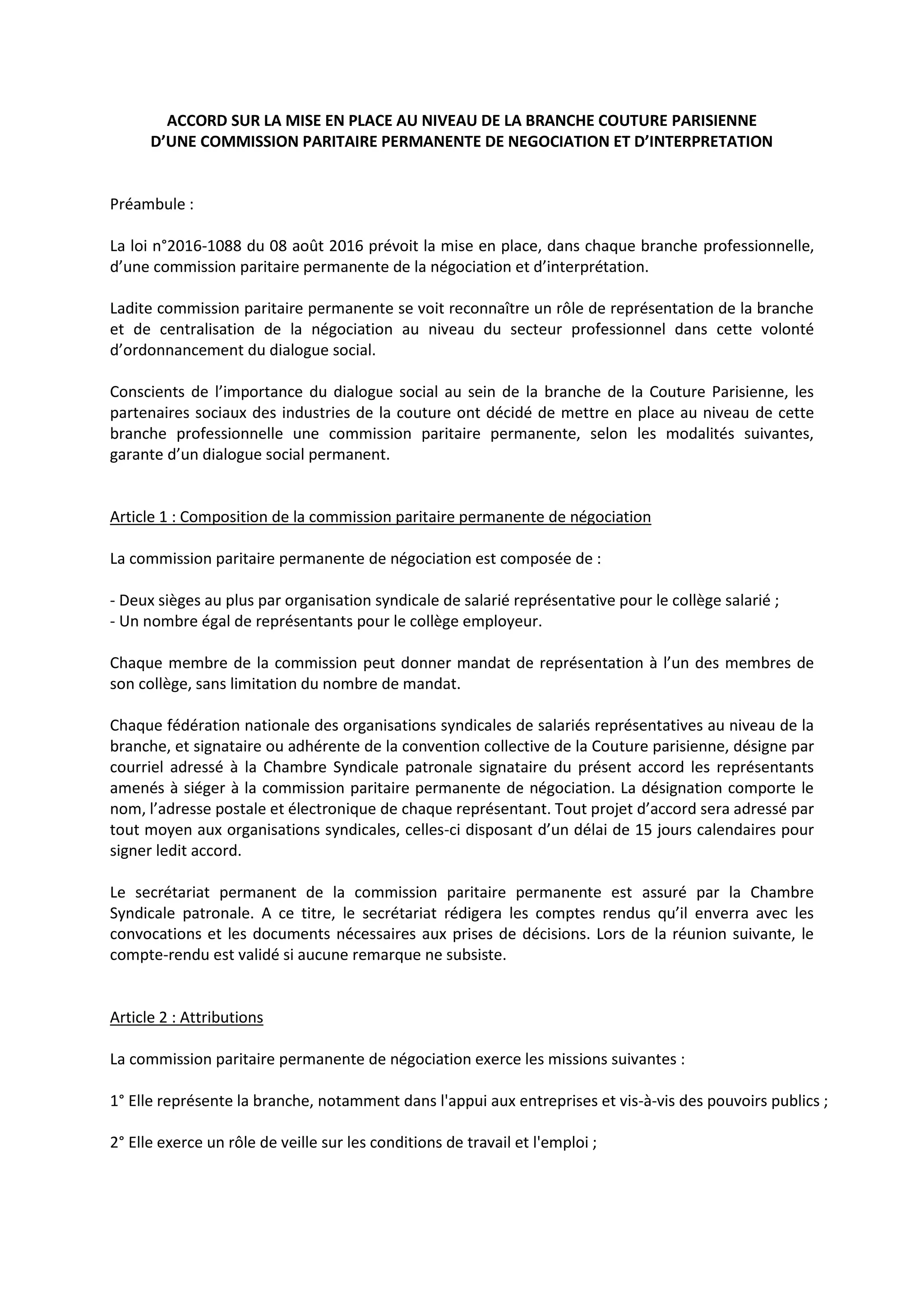 Le document établit un accord pour la création d'une commission paritaire permanente de négociation au sein de la branche couture parisienne, conformément à la loi n°2016-1088. Cette commission a pour mission de représenter la branche, de négocier des accords collectifs et d'assurer un dialogue social continu. Elle est composée de représentants des syndicats de salariés et des employeurs, avec des modalités précises de fonctionnement et de réunion.