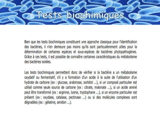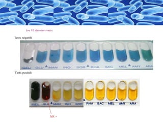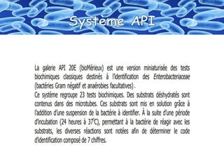 Le document décrit une méthode utilisant une galerie de 20 microtubes pour réaliser 23 tests biochimiques permettant d'identifier des bacilles gram négatif de la famille des enterobacteriaceae. Il détaille les étapes de préparation d'un inoculum à partir d'une souche pure, l'ensemencement et la lecture des résultats. Les résultats doivent être rapportés sur une fiche d'identification en se référant à un code spécifique.