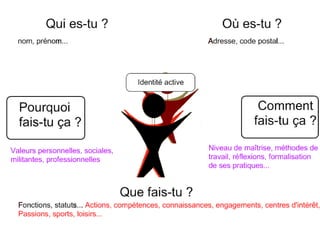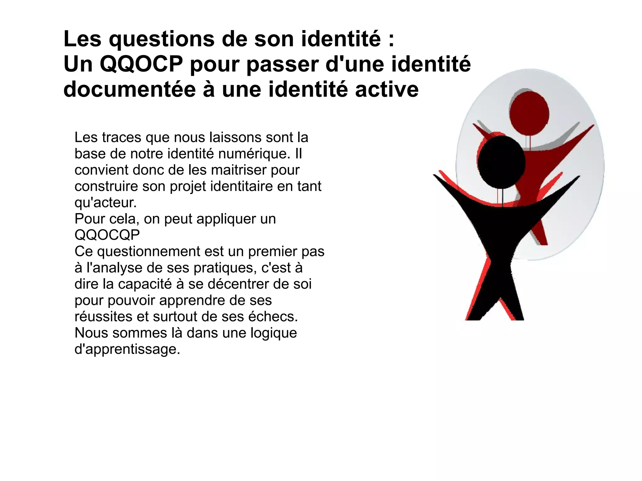 Le document aborde la question de l'identité numérique et l'importance de maîtriser les traces laissées pour construire un projet identitaire. Il propose l'application d'un questionnement pour analyser ses pratiques, favorisant un apprentissage à partir des réussites et des échecs. Cette approche encourage une réflexion décentrée et active sur son identité.