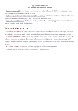 Le document traite des complications précoces de l'infarctus du myocarde, notamment les troubles du rythme cardiaque tels que la bradycardie sinusale et la tachycardie ventriculaire. Il aborde également les troubles de conduction, l'insuffisance cardiaque selon la classification de Killip, et les complications mécaniques comme la rupture septale et l'anévrisme ventriculaire. Enfin, il mentionne des complications tardives comme le syndrome de Dressler et les risques liés à des récidives d'angor.