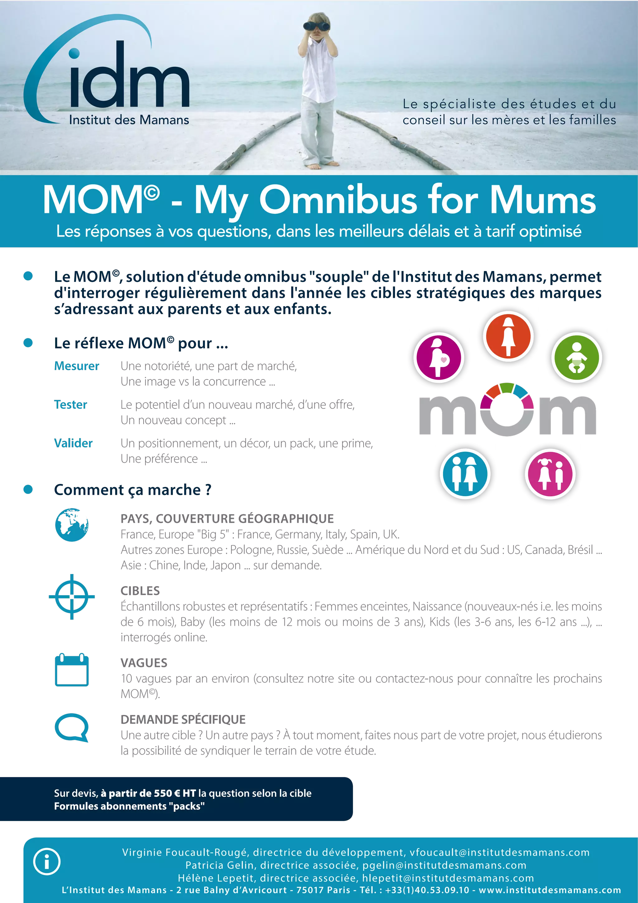Le MOM© est un service d'étude omnibus proposé par l'Institut des Mamans, destiné à interroger les cibles stratégiques des marques s'adressant aux parents et aux enfants. Il permet d'évaluer la notoriété, le positionnement et de tester des concepts sur des échantillons représentatifs en France et dans d'autres pays. Des formules d'abonnement et des demandes spécifiques sont également disponibles pour des études personnalisées.