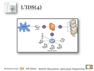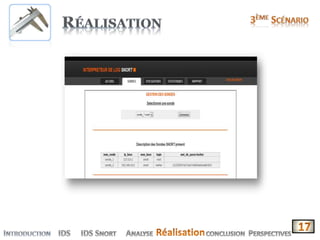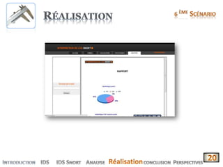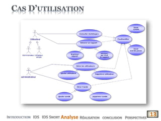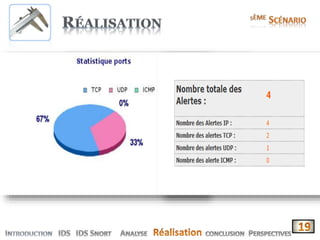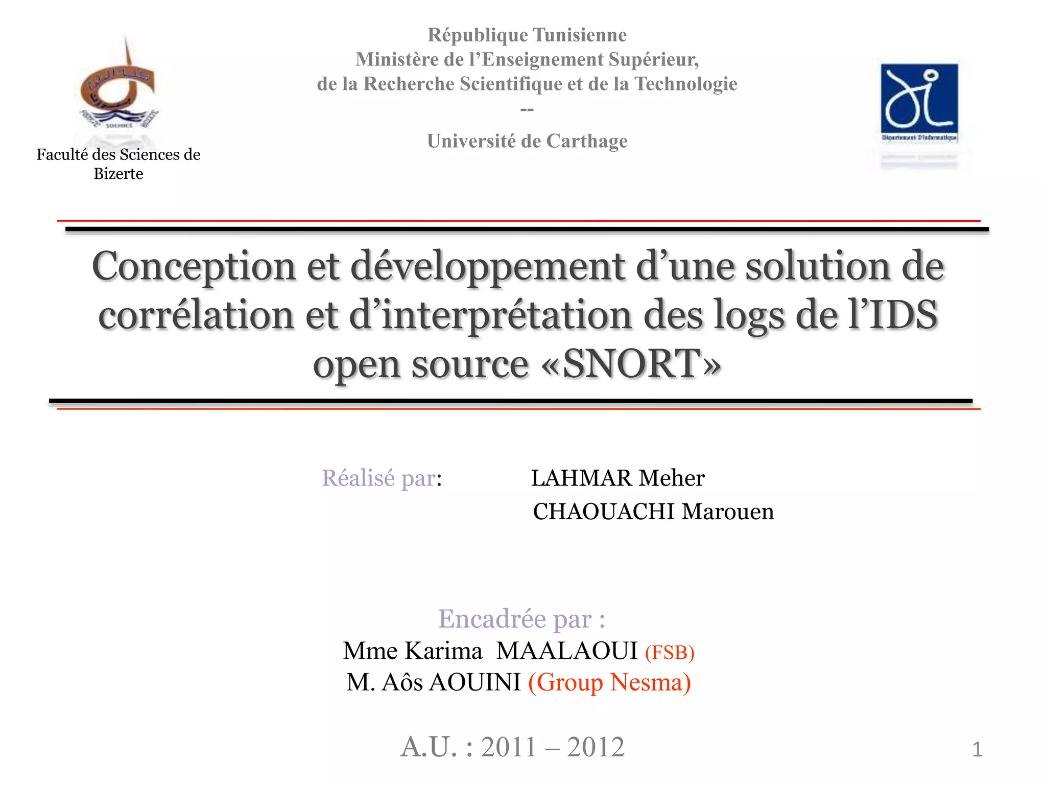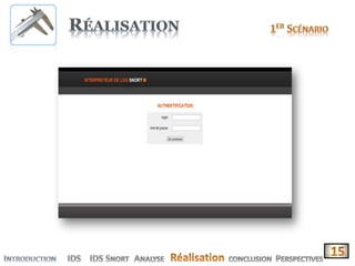 Le document présente la conception et le développement d'une solution pour la corrélation et l'interprétation des logs de l'IDS open source 'Snort'. Il décrit les fonctionnalités de l'application, son importance dans la sécurité informatique, ainsi que les différents types d'IDS. Enfin, il aborde les avantages et inconvénients de l'utilisation de Snort, mettant en avant sa nature open source et sa large communauté d'utilisateurs.