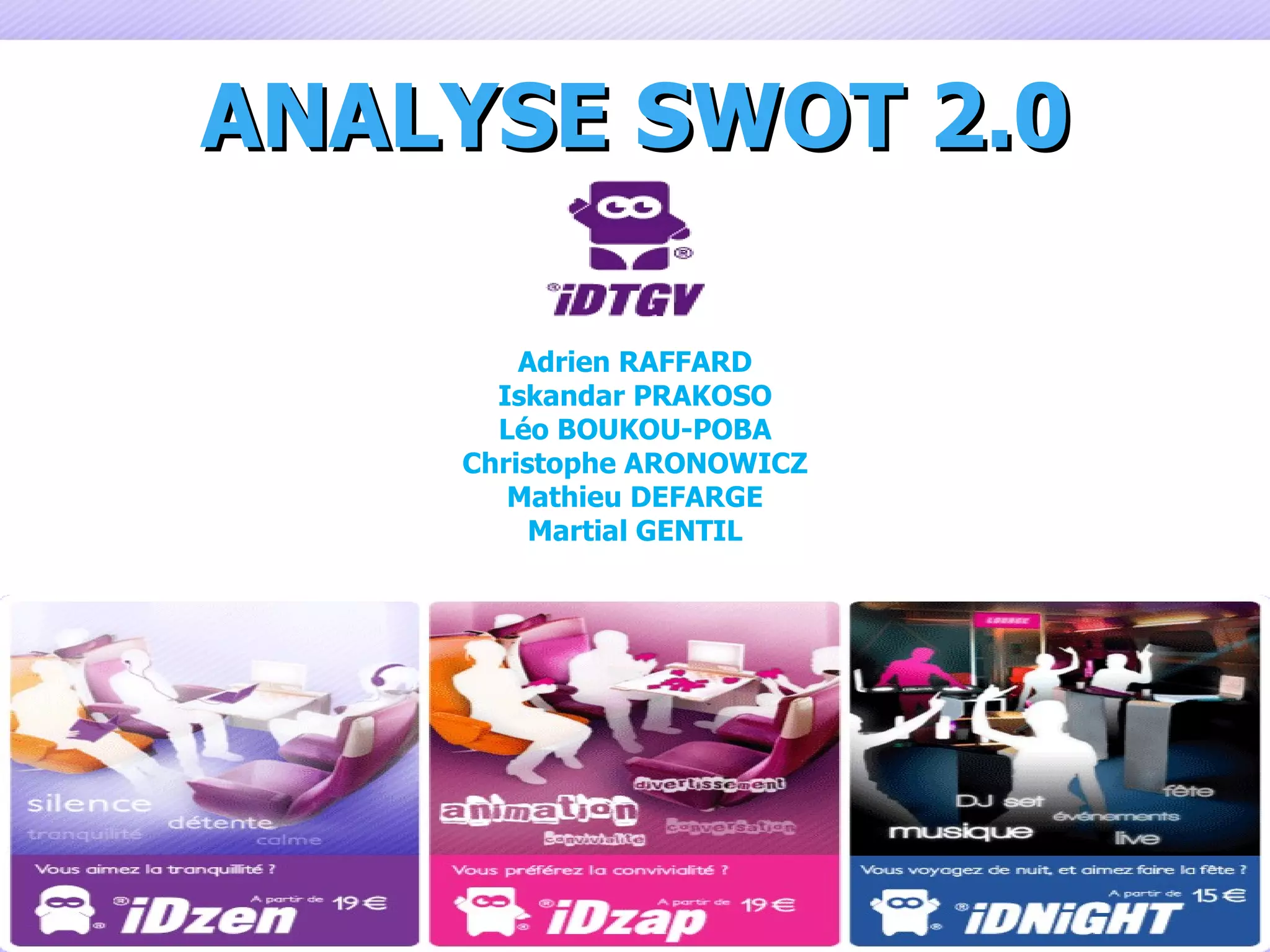Le document présente une analyse SWOT d'IDTGV, une filiale de la SNCF, mettant en avant ses forces comme des offres de voyage à bas prix basées sur des ambiances variées, mais aussi des faiblesses comme le manque de flexibilité pour les billets. Il aborde les opportunités d'optimisation via les nouvelles technologies et les réseaux sociaux, tout en soulignant les menaces de concurrence croissante dans le secteur ferroviaire. Des recommandations sont fournies pour le développement d'un site mobile et d'une application dédiée pour améliorer l'accessibilité des services.