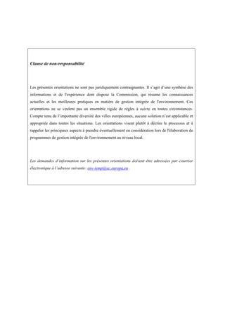 Le document présente des orientations non contraignantes pour la gestion intégrée de l'environnement (GIE) dans les villes européennes, en mettant l'accent sur l'importance d'adopter des pratiques adaptées aux divers contextes urbains. Il souligne les défis environnementaux rencontrés par les zones urbaines et promeut une approche intégrée pour améliorer l'efficacité des politiques environnementales tout en tenant compte des priorités locales. Les orientations visent à aider les autorités municipales à établir des systèmes efficaces de GIE, en encourageant la coopération et la participation citoyenne.