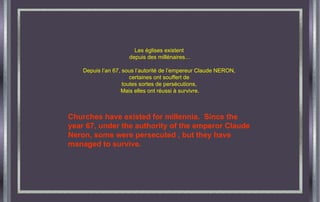 Les églises existent depuis des millénaires, ayant survécu à diverses persécutions depuis l'an 67. Des exemples notables incluent la cathédrale Saint-Basile à Moscou, construite en 1555, et la cathédrale du Christ Sauveur, dynamitée par Staline en 1931 et reconstruite depuis. Beaucoup d'autres églises dans des pays touchés par des conflits ont également été sauvées de la destruction et de la dégradation.