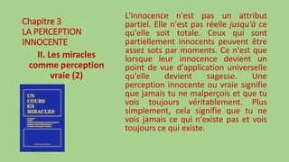 Le chapitre traite de la perception innocente et de la manière dont les miracles représentent une forme de perception vraie, excluant toute forme d'erreur. L'innocence totale est nécessaire pour voir la vérité, car ceux qui sont partiellement innocents peuvent mal percevoir. En acceptant et en investissant sa foi dans ce qui est vrai, on peut guérir à travers le miracle en percevant les autres comme ils sont réellement.