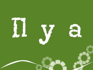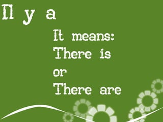 Le document explique l'utilisation de l'expression française 'il y a' pour indiquer la présence de quelque chose. Il fournit plusieurs exemples d'objets et d'animaux décrits en utilisant cette expression. Il invite également à identifier des éléments visibles dans une diapositive suivante en commençant les phrases par 'il y a'.