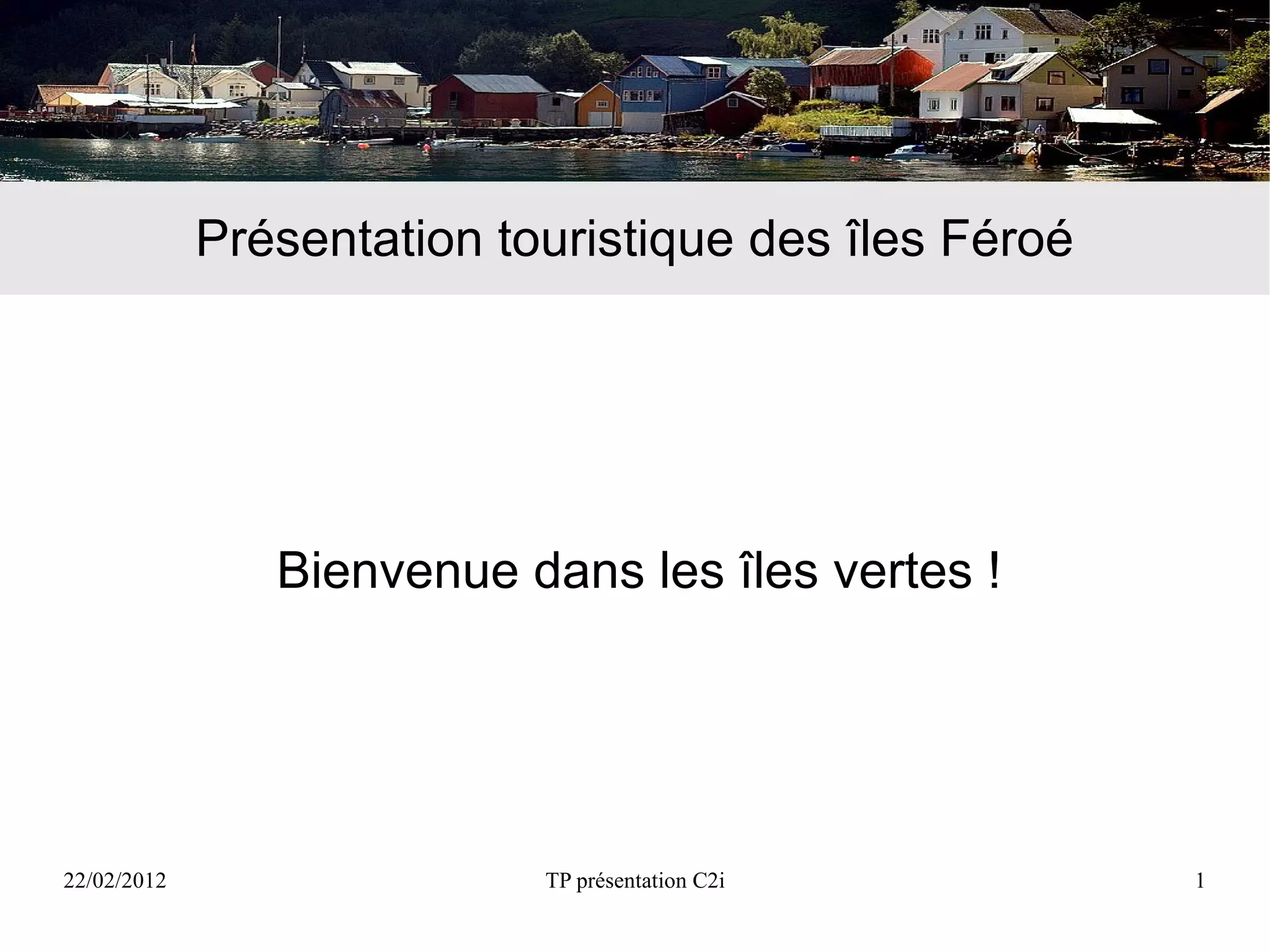 Les îles Féroé, un archipel de 17 îles au sud de l'Islande, proposent un climat tempéré et sont idéales pour des vacances. La présentation mentionne les principales villes comme Torshavn et Vagar, ainsi que des informations sur la pêche de diverses espèces maritimes. Un organigramme lié à l'ambassade de France est également inclus.
