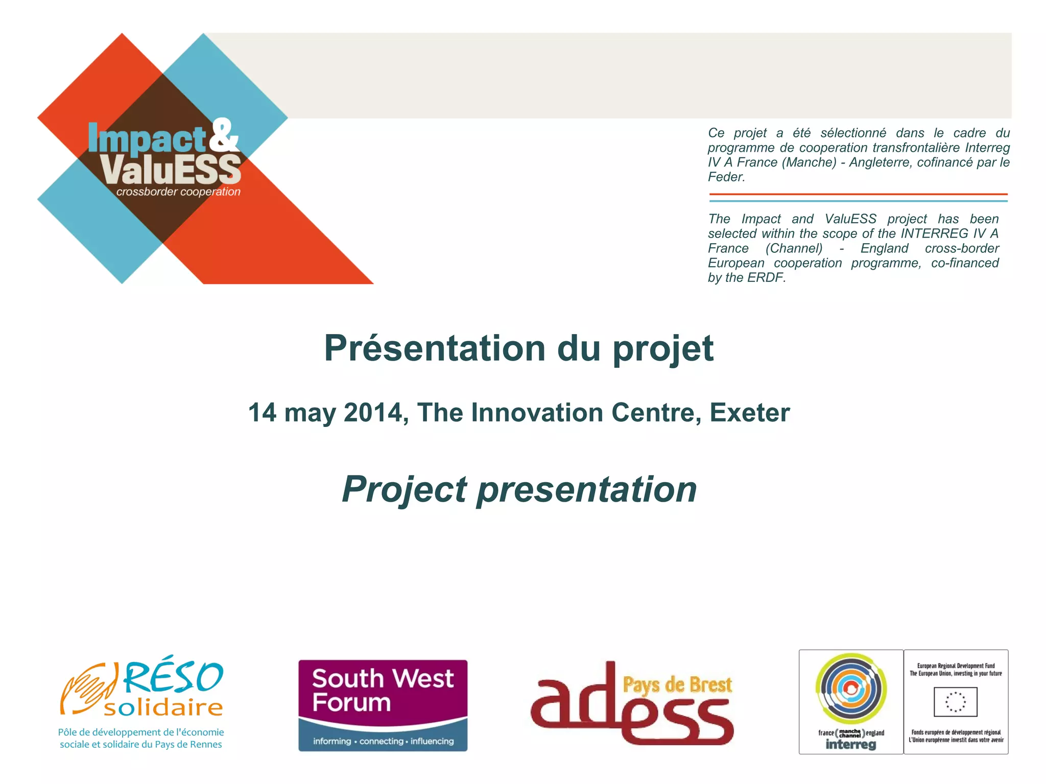 Le projet présenté, sélectionné dans le cadre du programme Interreg IV A, vise à renforcer les partenariats entre l'économie sociale et les secteurs public et privé. Il se concentre sur l'évaluation de l'impact et la valorisation de l'impact social, avec des événements franco-britanniques prévus à Exeter et Rennes. Ce projet est cofinancé par le Fonds européen de développement régional (FEDER).
