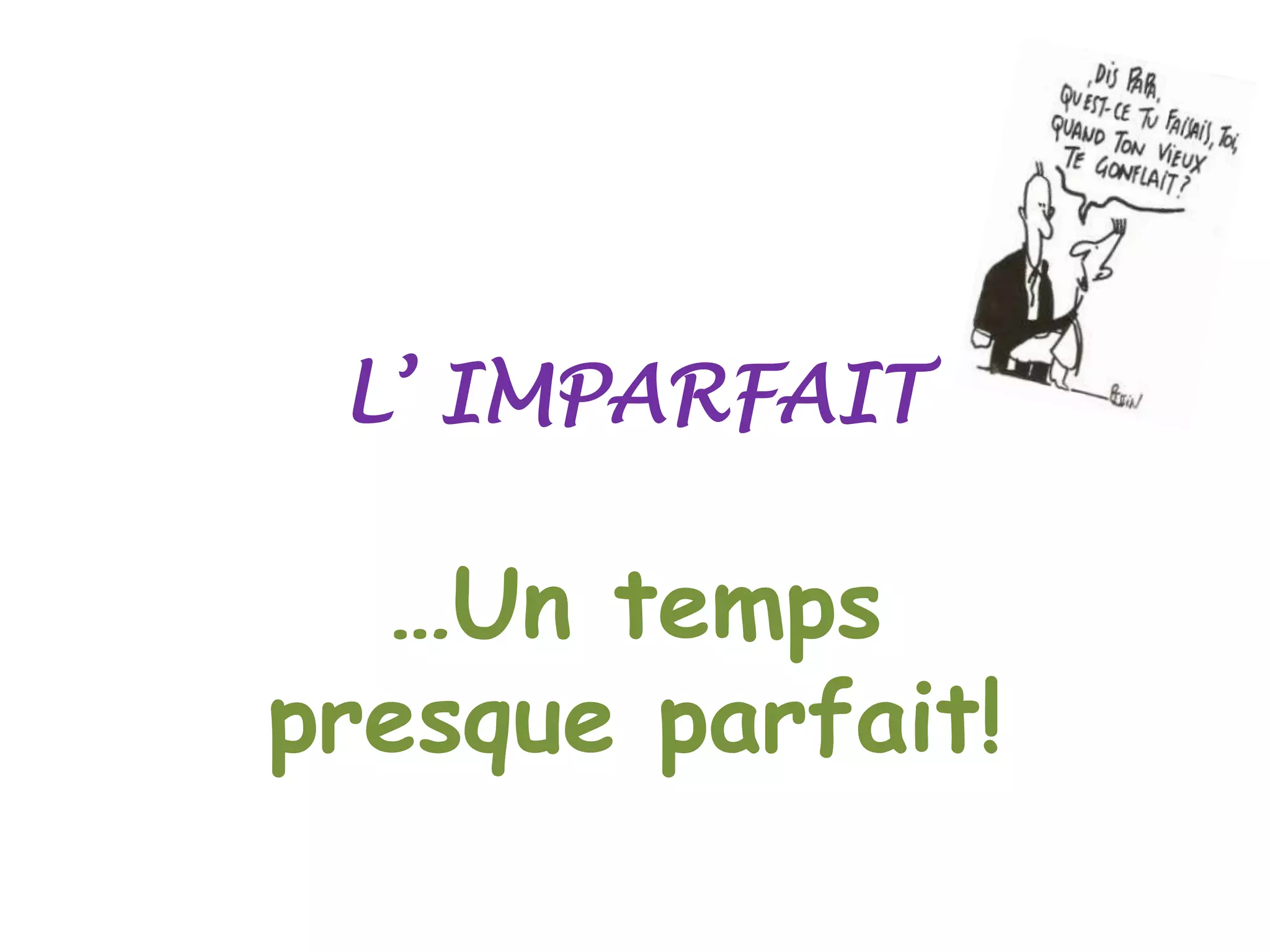 L'imparfait est un temps verbal qui décrit des actions ou faits passés. Sa formation est régulière, sauf pour le verbe 'être', et il est utilisé pour exprimer des actions habituelles, des durées, des descriptions et des demandes atténuées. Plusieurs exceptions existent avec certains groupes de verbes tels que ceux en -ger, -cer, -yer et -ier.
