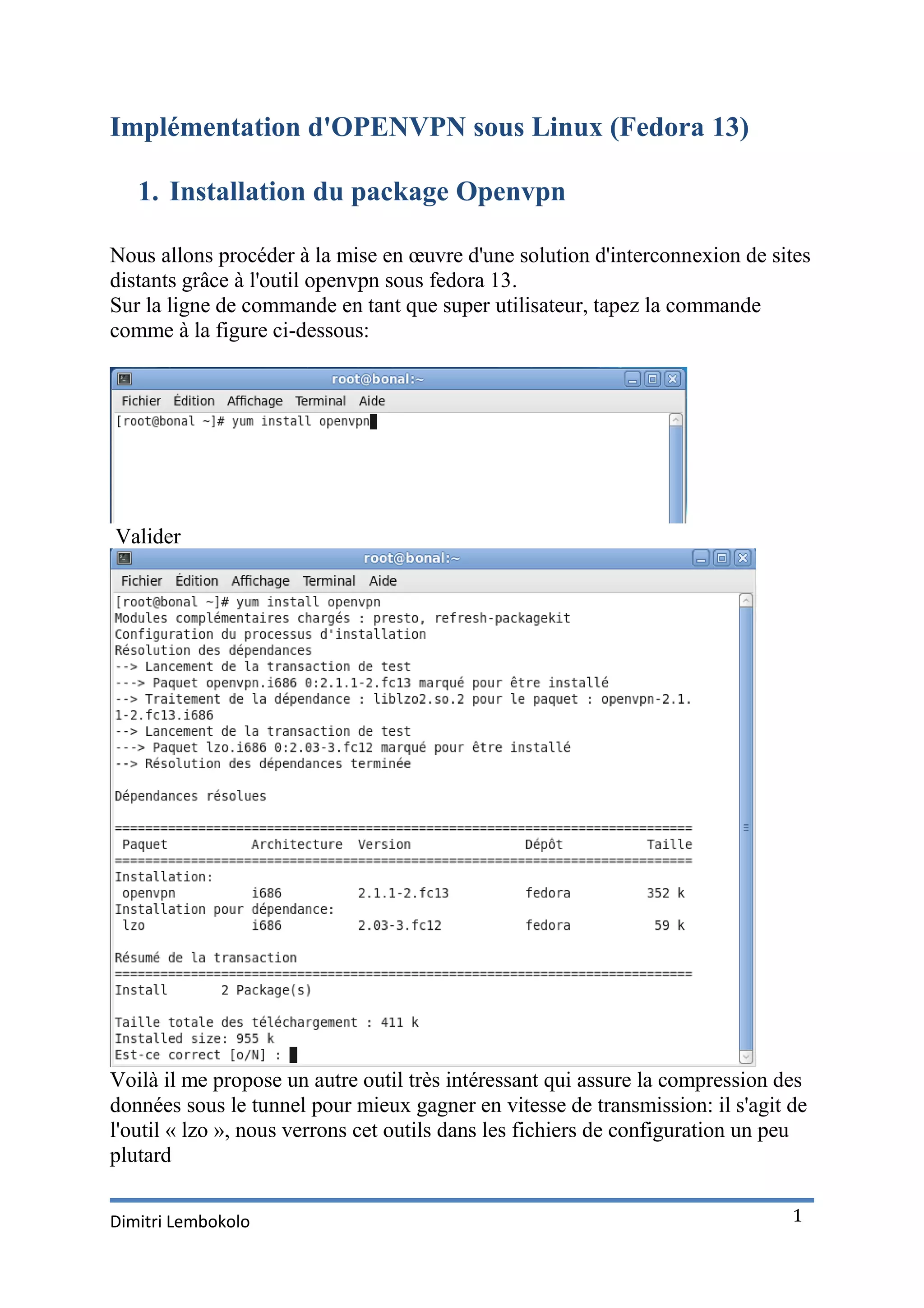 Ce document décrit l'implémentation d'OpenVPN sous Linux (Fedora 13) en détaillant les étapes d'installation, de génération des certificats d'authentification pour le serveur et les clients, ainsi que la configuration et le lancement du serveur. Il aborde également l'installation et la configuration des clients sur Windows, en soulignant l'importance de la connexion sécurisée entre plusieurs sites distants. Enfin, il mentionne la possibilité d'utiliser des services comme DynDNS pour gérer les adresses IP dynamiques.