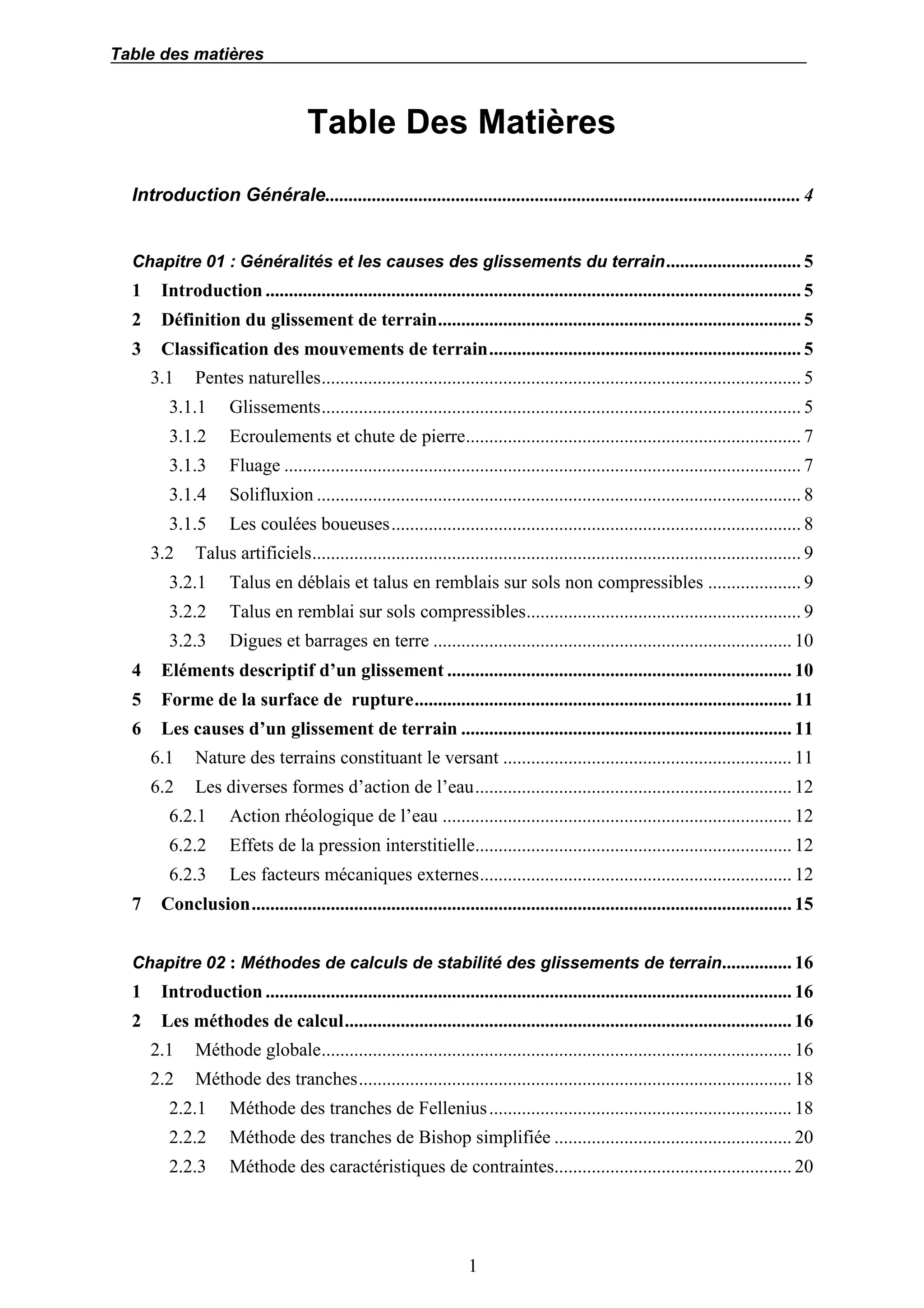 Le document explore les glissements de terrain, en détaillant leurs causes, classifications et méthodes de calcul et de confortement. Les mouvements de terrain, souvent entraînés par des facteurs naturels ou humains, peuvent causer d'importants dommages matériels et humains. Des méthodes de stabilisation sont proposées pour remédier à ces instabilités.