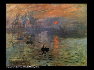 L'impressionnisme émerge à la fin du XIXe siècle en réaction au réalisme, se concentrant sur la lumière et le mouvement de la vie quotidienne plutôt que sur des sujets historiques. Les artistes, tels que Monet, Renoir et Degas, peignent en plein air avec de petites touches de couleur pour capturer des scènes de la vie urbaine et de la nature. Leur objectif est de représenter les perceptions visuelles plutôt que la réalité strictement objective.