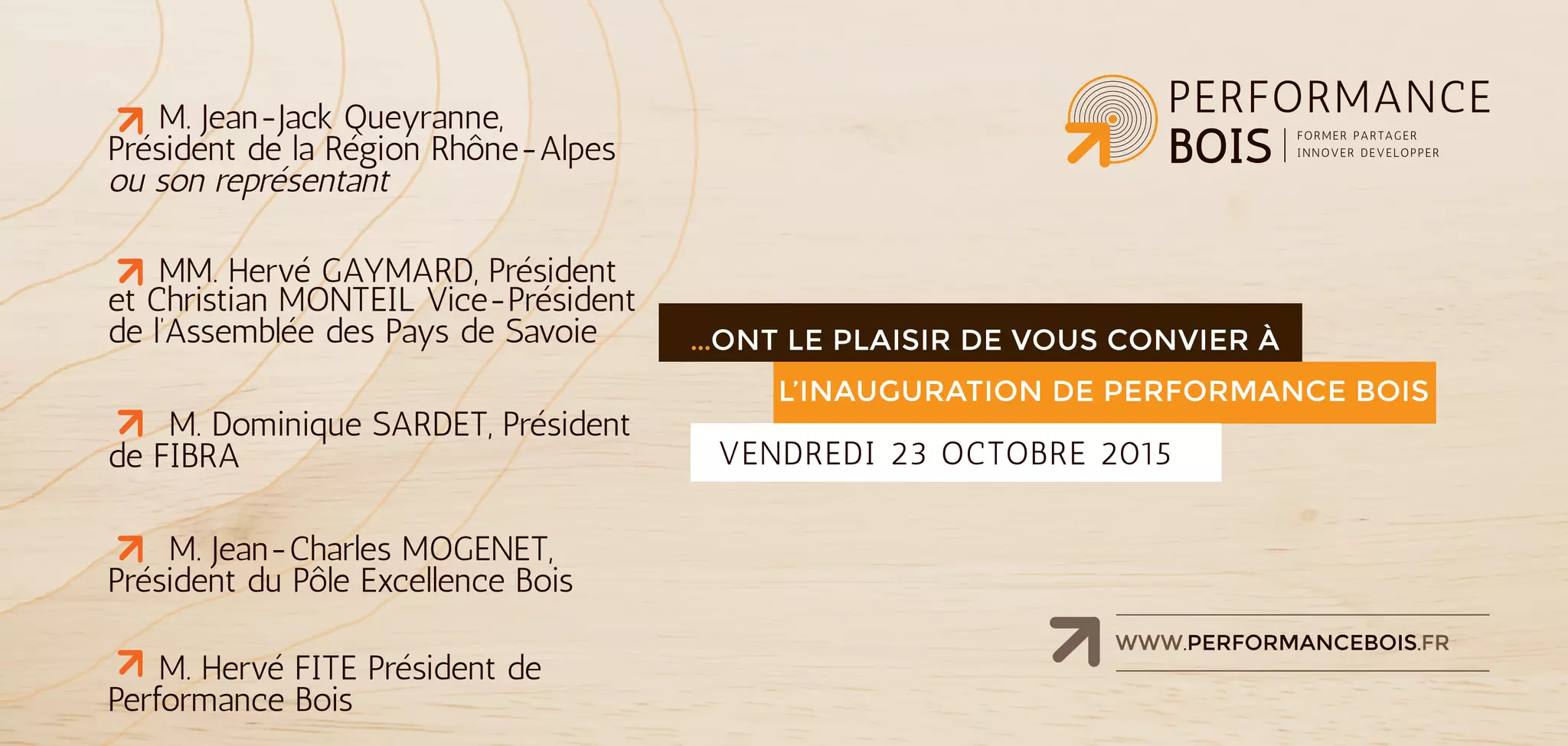 L'inauguration de la plateforme Performance Bois a eu lieu le 23 octobre 2015, après deux ans de conception, pour servir les professionnels du secteur. L'événement a présenté des allocutions de divers représentants régionaux et une analyse par Alain Vargas de l'agence Tectoniques sur les évolutions dans l'acte de construire. La journée a également inclus des présentations sur Performance Bois et un buffet pour les participants.