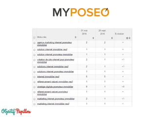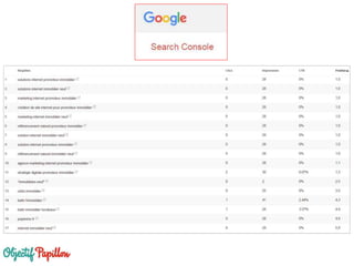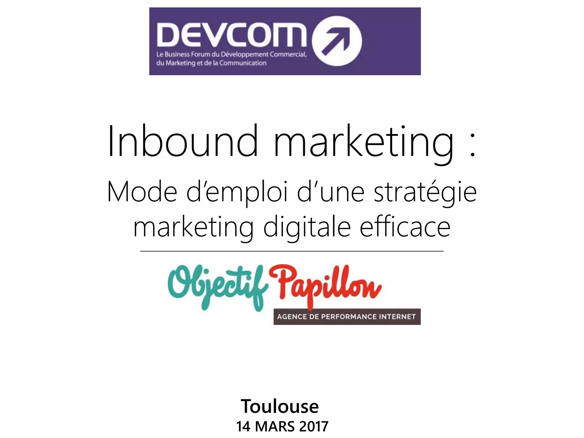 Le document présente une stratégie d'inbound marketing efficace, insistant sur l'importance de comprendre les intentions des visiteurs via des personas et l'utilisation de techniques de SEO pour optimiser la visibilité. Il aborde également les différents piliers du SEO, tels que la technique, le contenu, le maillage interne et le netlinking, tout en soulignant le rôle crucial des données analytiques. Enfin, il évoque l'intégration des relations publiques digitales avec le marketing de contenu pour renforcer la présence de la marque en ligne.