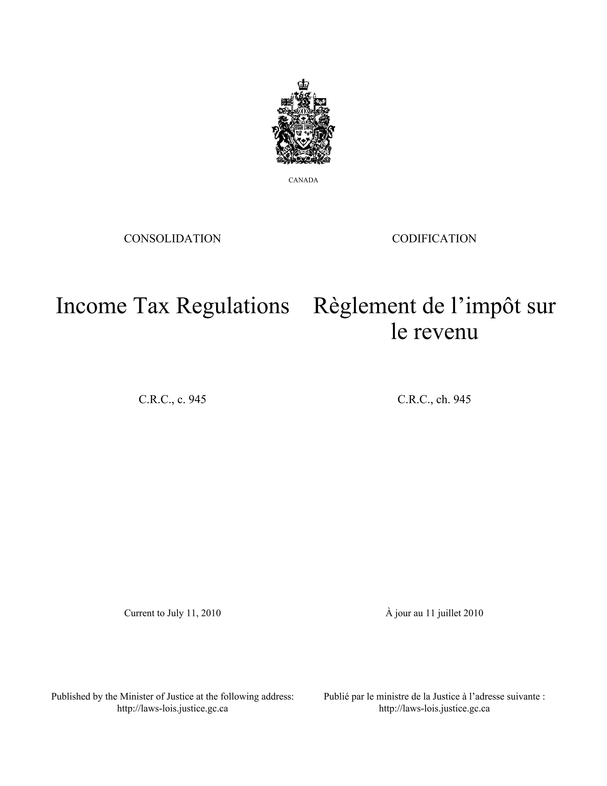 Le document est une codification des règlements de l'impôt sur le revenu du Canada, à jour au 11 juillet 2010. Il précise des définitions clés et des dispositions sur les déductions fiscales, les crédits d'impôt, et les modalités de publication officielle des règlements. Des instructions sur la priorité des règlements en cas d'inconsistance sont également incluses.