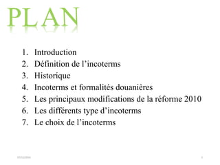 Le document présente les incoterms, des règles standardisées définissant les obligations des acheteurs et vendeurs dans le commerce international. Il décrit leur historique, leurs caractéristiques essentielles, ainsi que les changements majeurs apportés par la réforme de 2010. Les incoterms facilitent les échanges en clarifiant qui supporte les coûts et les risques liés au transport des marchandises.