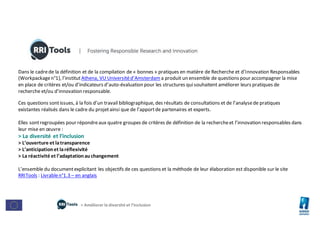 Le document présente un ensemble de questions pour améliorer la diversité et l'inclusion dans la recherche et l'innovation responsables, élaboré par l'Institut Athena et l'Université d'Amsterdam. Ces questions visent à accompagner les structures dans l'auto-évaluation de leurs pratiques et couvrent des critères tels que la représentativité des parties prenantes et les stratégies de recrutement. La synthèse inclut des recommandations sur l'implication des communautés concernées et sur l'élaboration de méthodes de recherche adaptées.