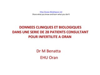 Le document présente des données cliniques et biologiques sur 28 patients consultants pour infertilité, avec une analyse des causes et facteurs associés, notamment l'azoospermie. Des résultats indiquent diverses atteintes testiculaires et des troubles liés à l'éjaculation, ainsi que des recommandations pour la prise en charge des patients azoospermes. Le texte soulève également des questions sur les prochaines étapes dans le traitement et l'évaluation génétique des patients concernés.