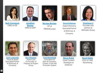 The document lists 10 marketing influencers on LinkedIn, providing brief descriptions of their roles and areas of expertise. Notable figures include Beth Comstock, Jonathan Becher, and Charlene Li, each offering insights on topics like business innovation, marketing strategy, and social business. It encourages following these influencers for valuable industry knowledge and updates.