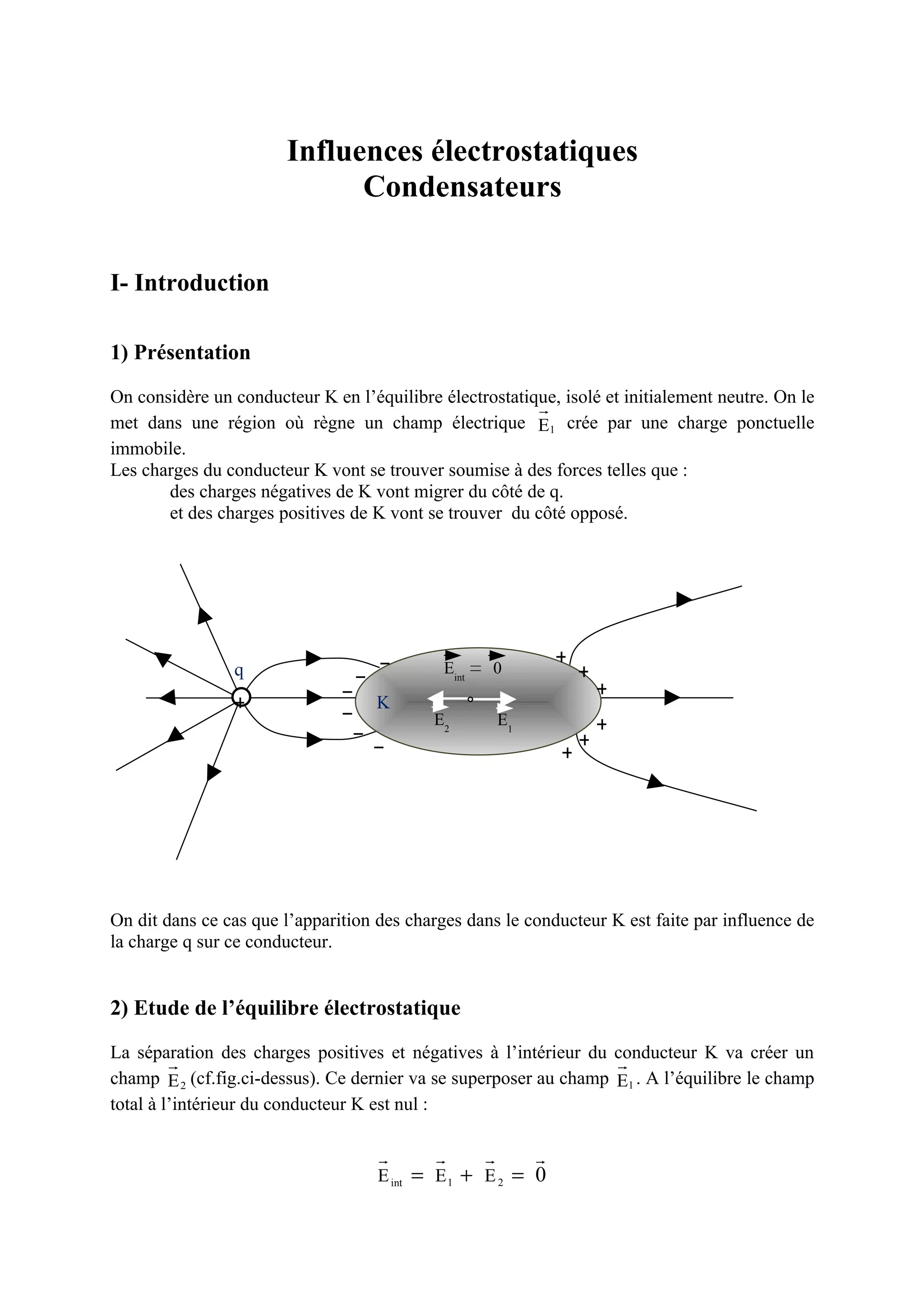 Le document traite de l'influence électrostatique entre conducteurs, décrivant comment les charges se répartissent dans un conducteur en contact avec un champ électrique. Il aborde des concepts tels que l'équilibre électrostatique, les coefficients d'influence, et l'énergie d'un système de charges. Enfin, les relations mathématiques sont formulées pour les systèmes de conducteurs et leur énergie électrostatique.