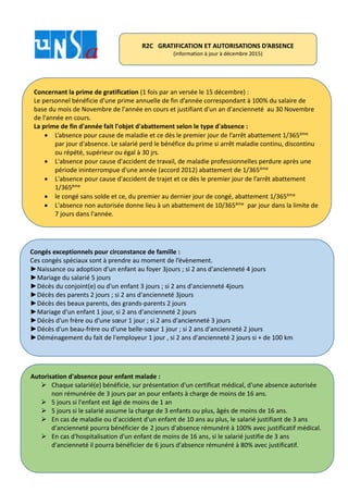 Le document décrit les conditions d'attribution de la prime de gratification annuelle versée le 15 décembre, basée sur le salaire de base de novembre et l'ancienneté, avec des abattements pour diverses absences. Il énonce également les droits aux congés exceptionnels pour événements familiaux et les autorisations d'absence pour maladie d'enfants à charge, avec des détails sur la durée et les conditions d'octroi. Les abattements impactent significativement le montant de la prime et la disponibilité des congés selon l'ancienneté et le type d'absence.