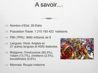 L'Inde compte 28 États et une population de plus de 1,2 milliard d'habitants, avec un PIB de 3680 milliards de dollars. Le marché de l'alcool varie selon les États, avec une augmentation des ventes de 8% et une consommation de spiritueux largement supérieure à celle du vin. La consommation d'alcool est influencée par des facteurs socio-économiques, avec des points de vente tels que bars, restaurants et magasins de vin.