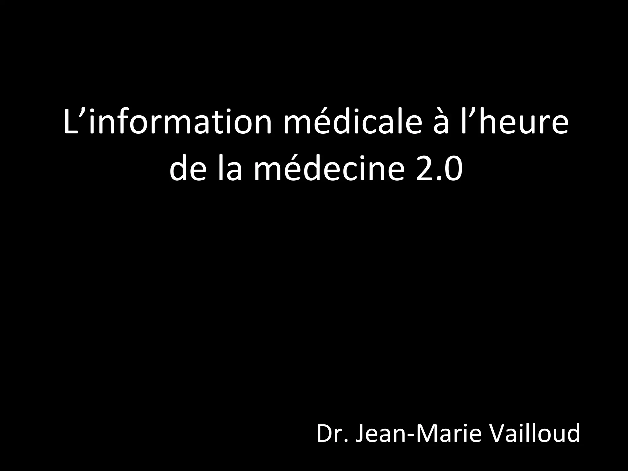 Le document présente un diaporama sur l'utilisation d'Internet pour la recherche d'informations médicales, sans conflit d'intérêt. Il contient des recommandations de sites de confiance, des outils pour créer une veille documentaire et une liste de ressources médicales. La présentation est sous licence Creative Commons et se termine par une conclusion sur l'importance de ces ressources.