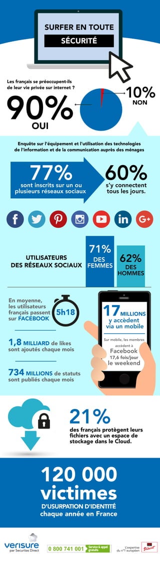 En France, 17 millions d'utilisateurs accèdent aux réseaux sociaux via mobile, avec 120 000 cas d'usurpation d'identité chaque année. Les Français se préoccupent de leur vie privée en ligne, et 60% sont inscrits sur un ou plusieurs réseaux sociaux, passant en moyenne 5h18 par jour en ligne. Les utilisateurs protègent leurs fichiers avec du cloud, observant également une activité élevée en termes de likes et de publications mensuelles.